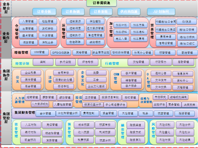 紫江商贸管理系统基本框架可以分为四个层面,业务整合层、业务操作层、集团协作层以及集团管控层。